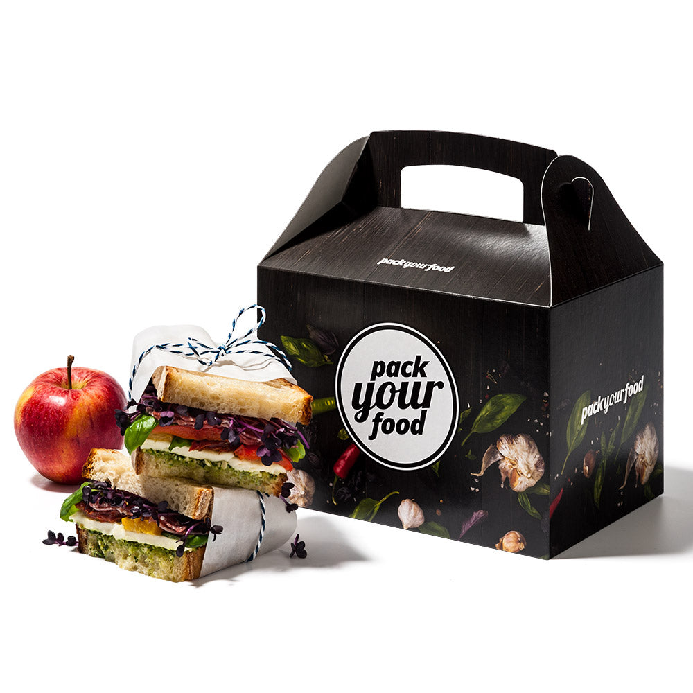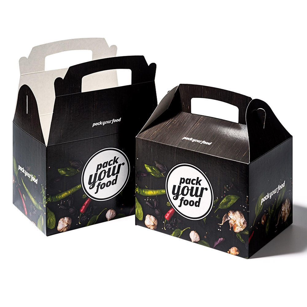 Sie können die Lunch Box – so wie alle unsere Verpackungen – auf der Außenseite komplett mit Ihrem eigenen Design, Logo, Adresse oder Slogan bedrucken. So trägt die Lunch Box nicht nur Ihr Food, sondern auch Ihren Brand in die Welt. Die Box wird von uns geklebt und flachliegend geliefert. Dank des integrierten Automatikbodens lässt sich die Lebensmittelbox einfach aufstellen und verschließen.