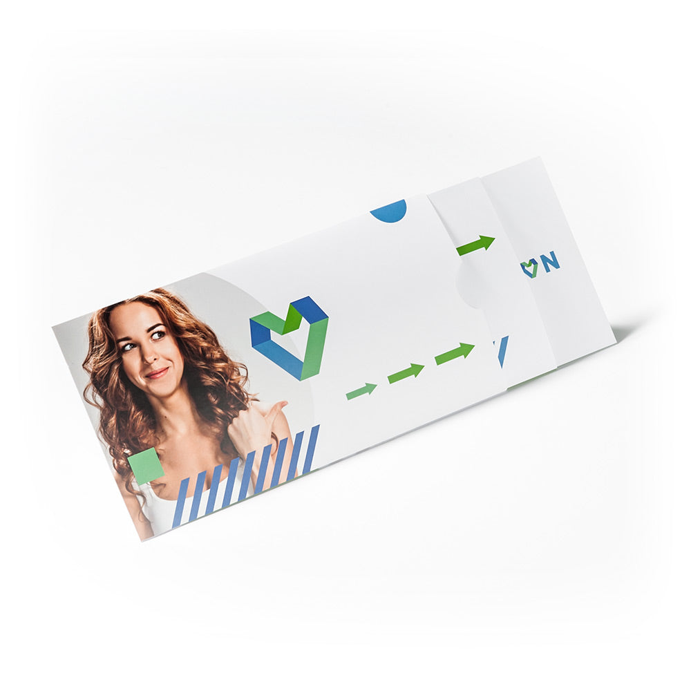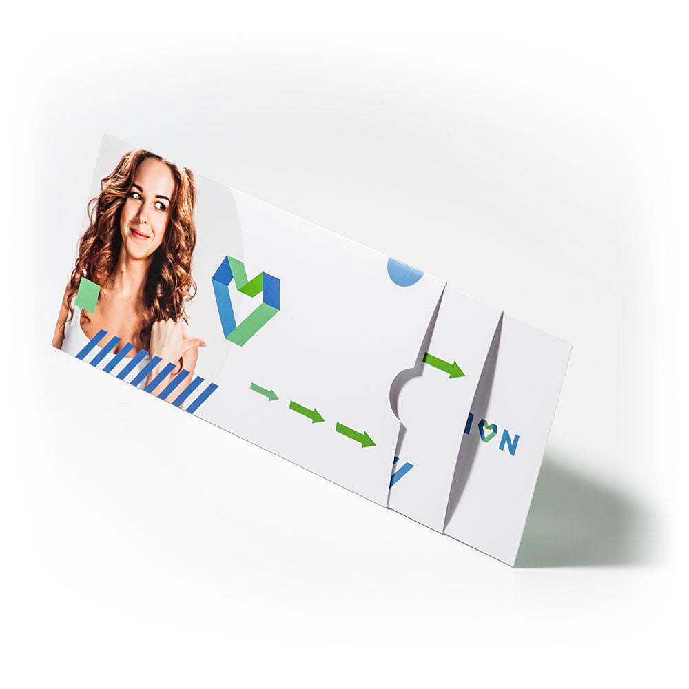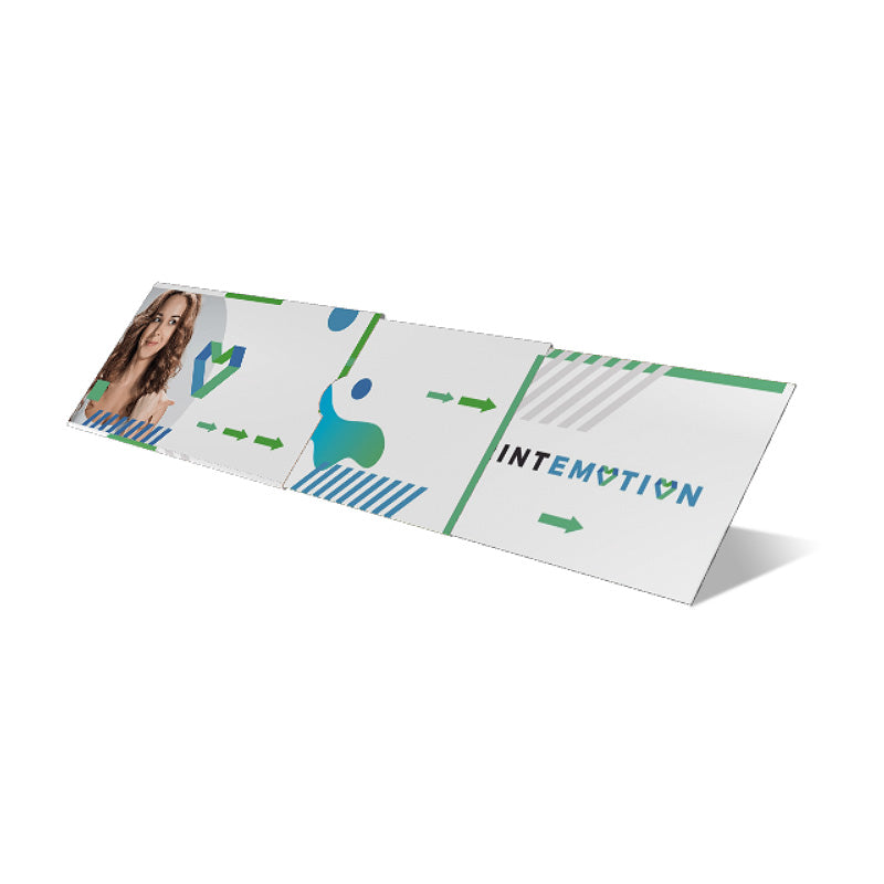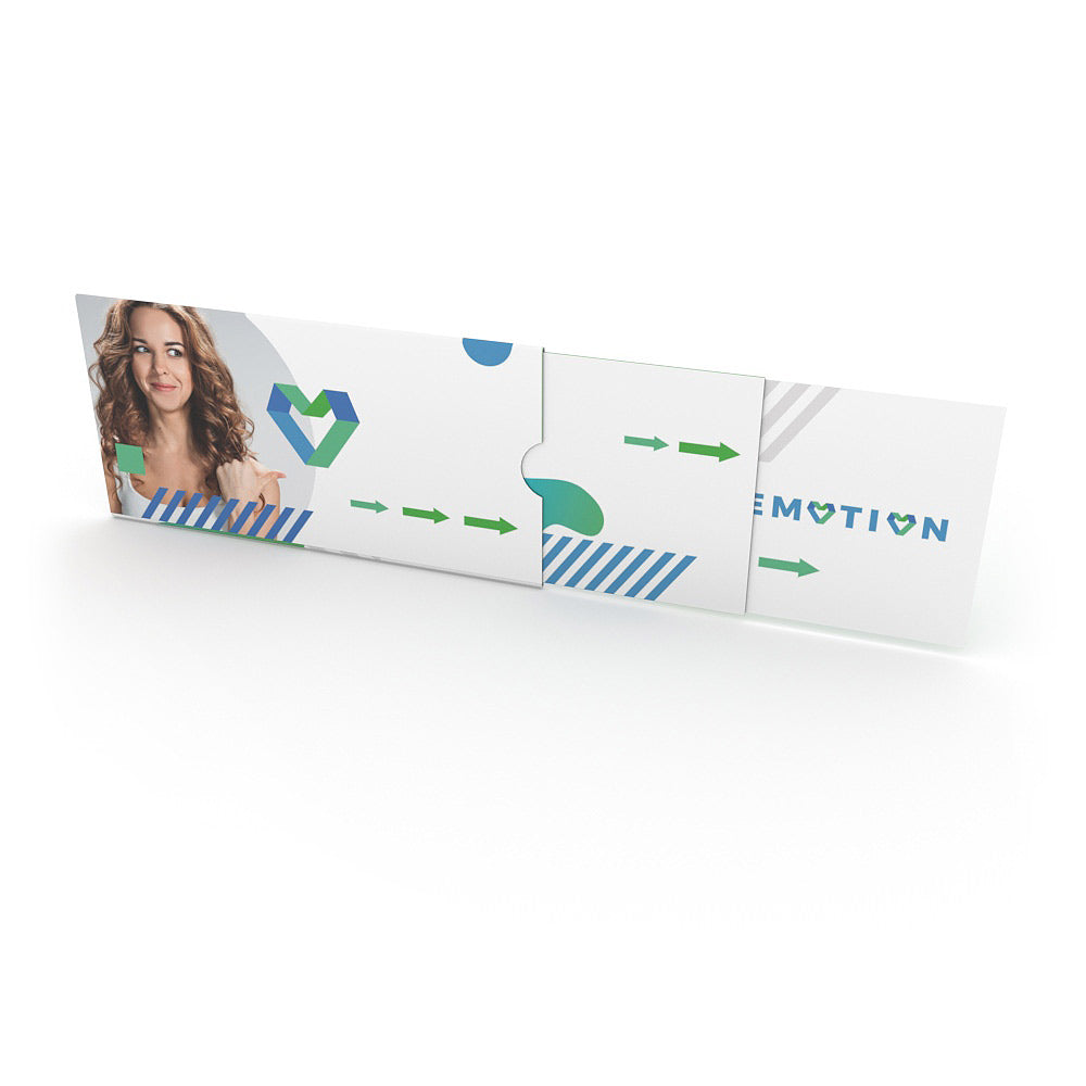 Auf den ersten Blick: ein Rechteck von 210 x 105 mm. Auf den zweiten: mehr. Viel mehr. Zieht man die beiden Schuber aus der Teleskopkarte heraus, entsteht eine Fläche von beeindruckenden 530 mm Länge. Die Ziehkarte bietet so Platz für sechs Motive auf Vorder- und Rückseite — oder für Designs im Panoramaformat, die erst vollständig sichtbar werden, wenn die Karte komplett ausgezogen ist.