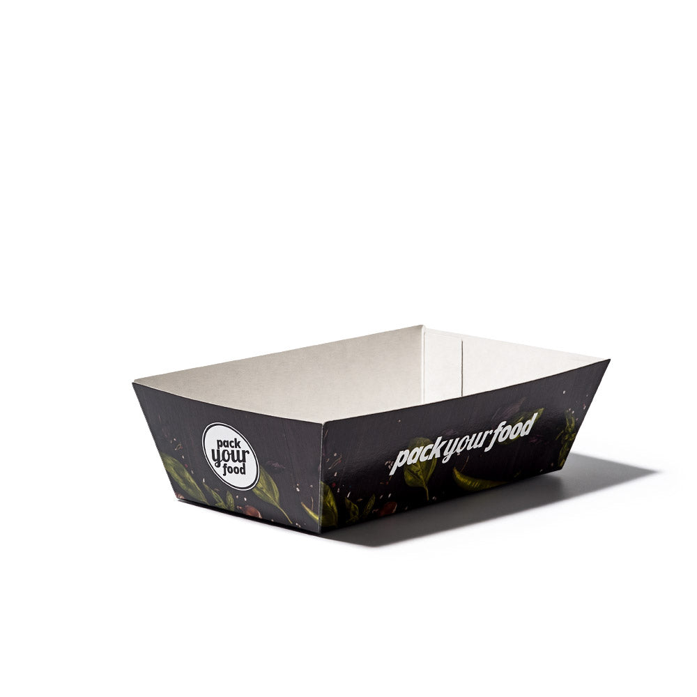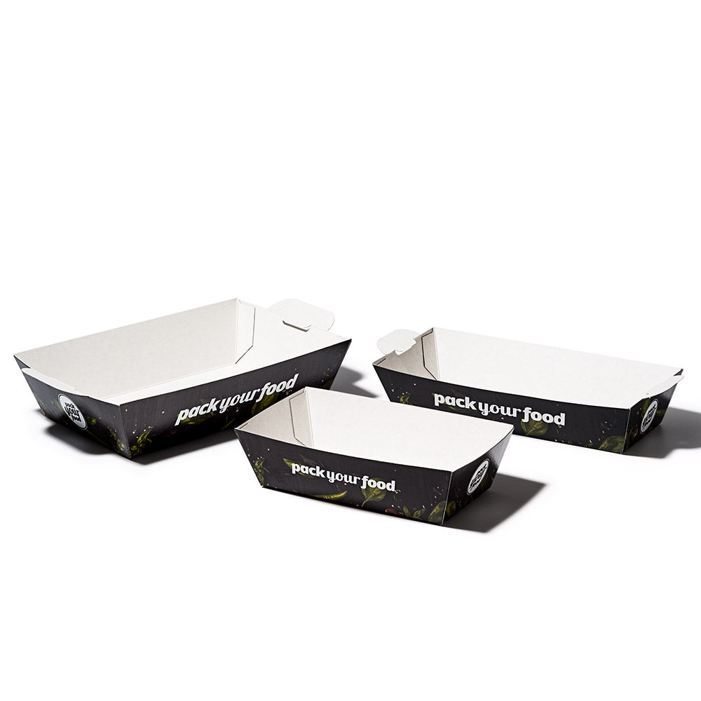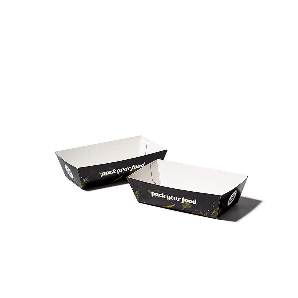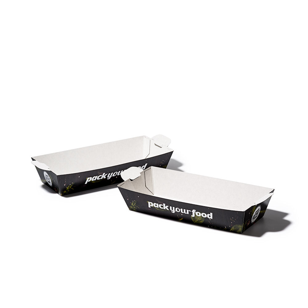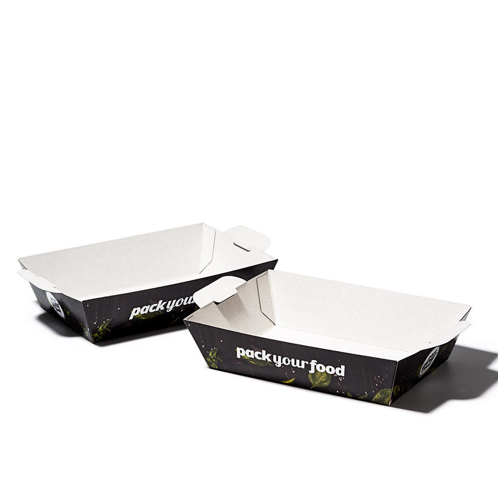 Die Snackschalen von pack your food sind besonder praktisch für den Take-Away-Snack – wenn Ihre Kunden der ganz große Hunger packt. Dank der speziellen Beschichtung auf der Innenseite der Snackschale, die auf pflanzlichen Rohstoffen wie etwa Stärke besteht, bleiben die Hände Ihrer Kunden auch bei feuchten und fettenden Lebensmitteln trocken. Wir bedrucken die Außenseite der Snackschale individuell nach Ihren Design-Wünschen, z.B. mit Ihrem Logo oder einem eigenen Layout. Dank des wasserbasierten Lacks, der über Ihr Design gedruckt wird, kann der Einsatz von Folien vermieden werden – und die Snackschale lässt sich nach erfolgreichem Hungerstillen dem Altpappierkreislauf zuführen.